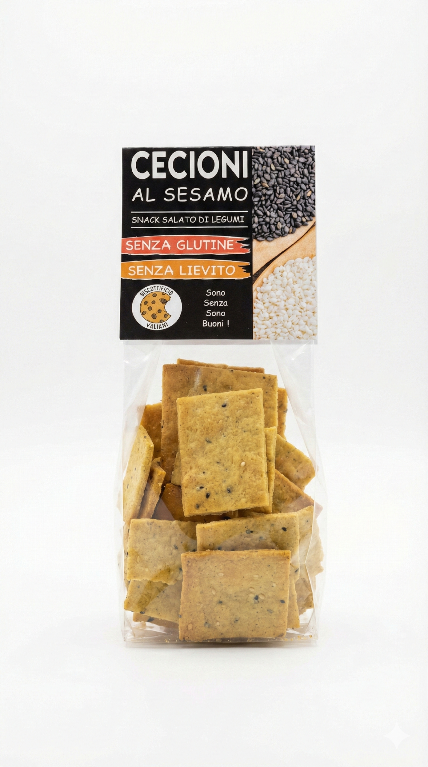 Cecioni al sesamo del Biscottificio Vaiani sono sfiziosi frollini vegani arricchiti con semi di sesamo, perfetti per chi cerca uno snack dal sapore tostato e genuino. La combinazione tra la croccantezza del biscotto e l’aroma del sesamo rende questo prodotto una scelta eccellente per una pausa nutriente e di alta qualità artigianale. ✔ Senza glutine…